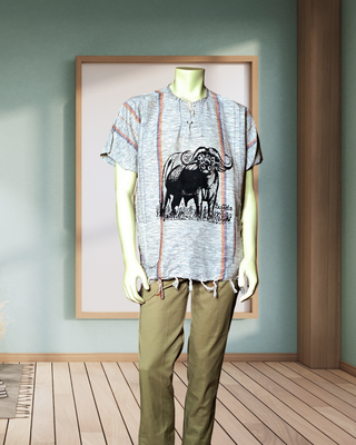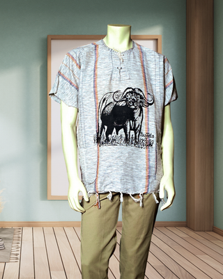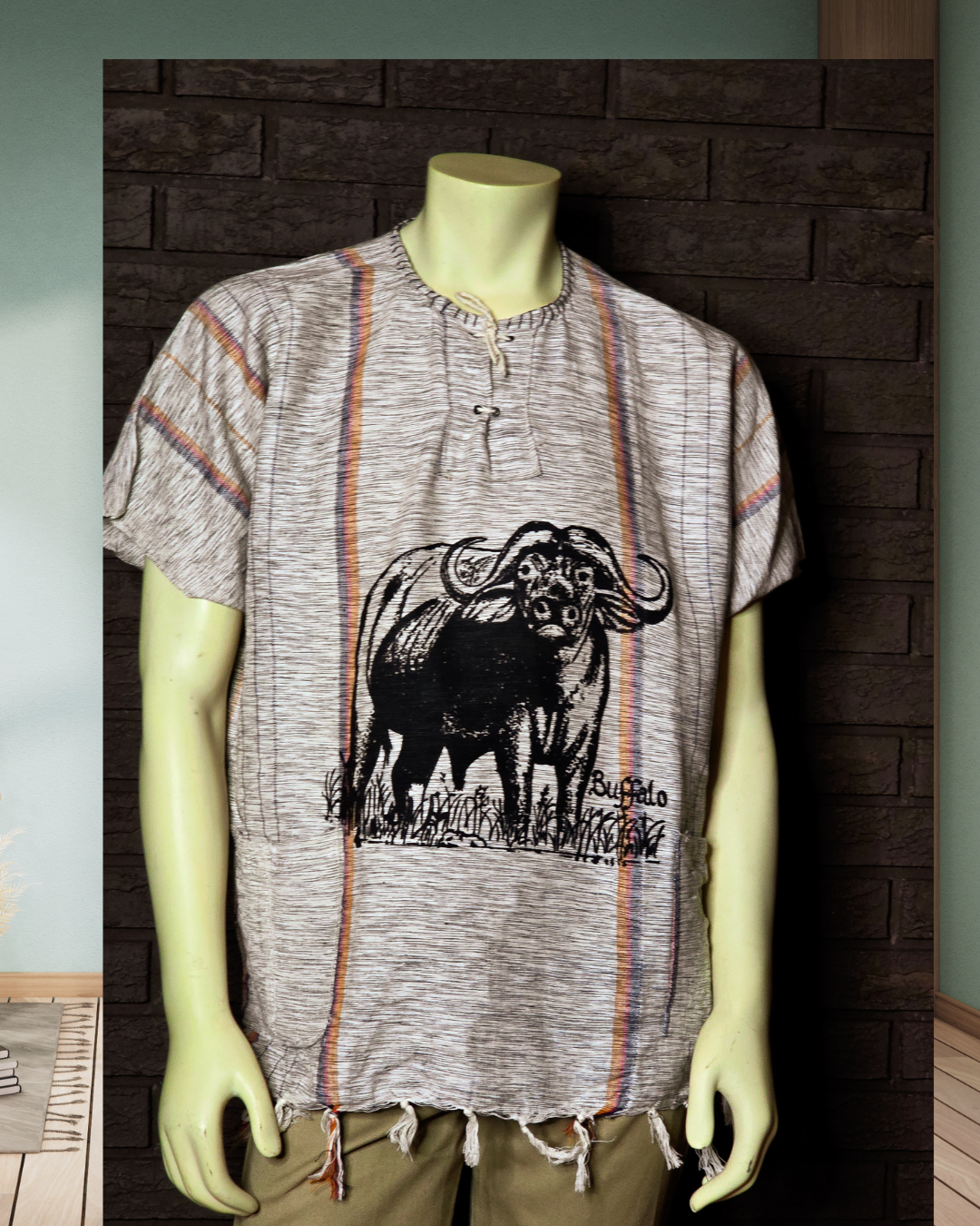 These are handwoven shirts and are safari inspired with buffalo animal print on it.