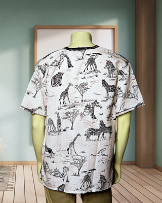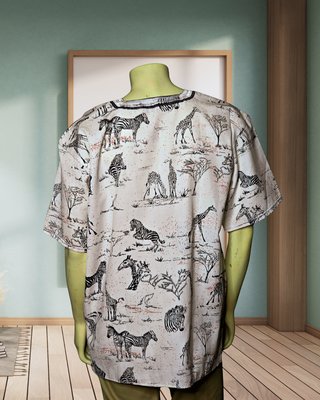 The shirts features wild animals, savanna trees and tribal patterns.