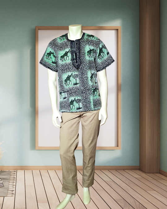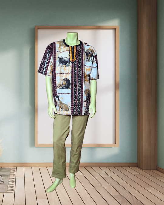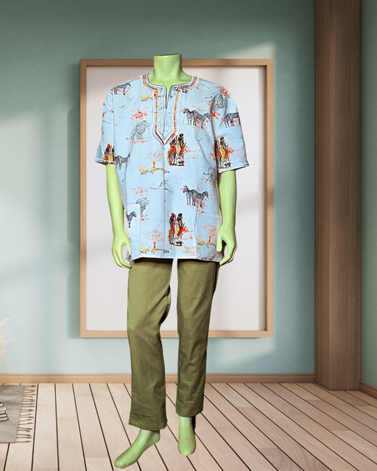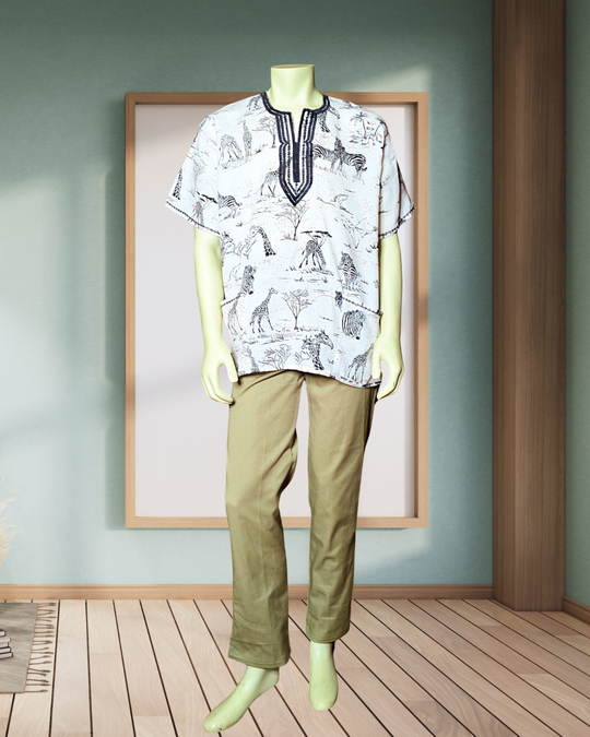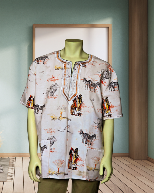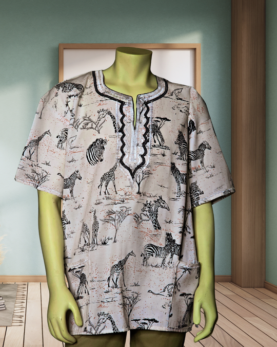 Wildlife and village style shirts designed to be airy and breathable because of it's loose fitting and comfortable style.The shirts features wild animals, savanna trees and tribal patterns.They are made by breathable, eco friendly and sustainable...Regular price $100.00 -
