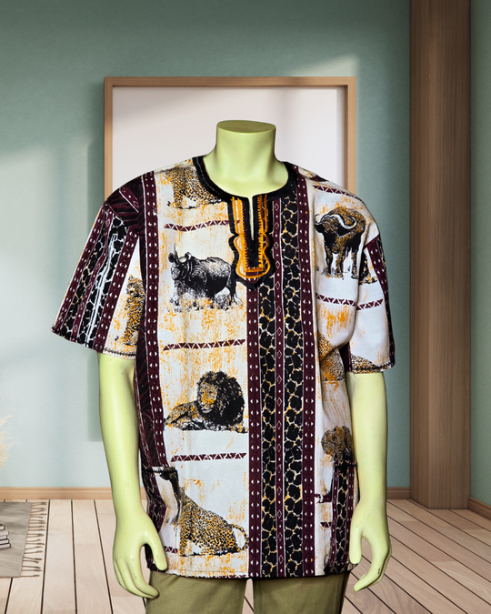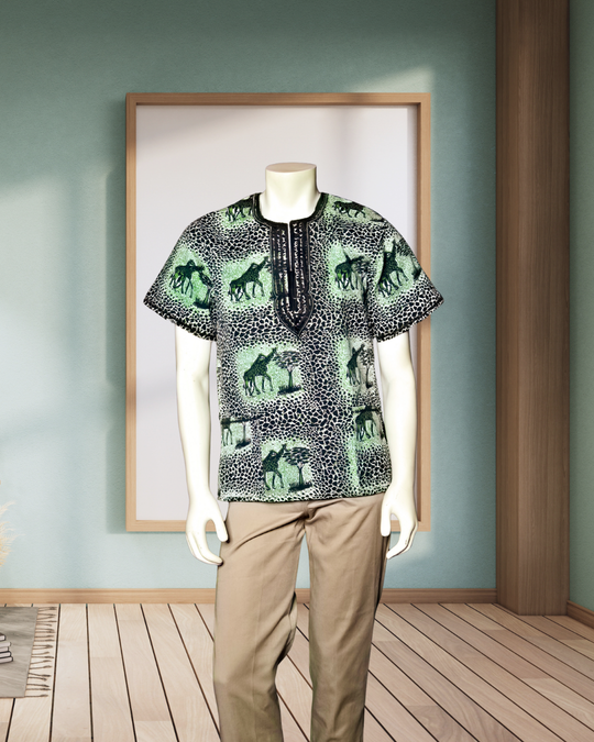Wildlife and village style shirts designed to be airy and breathable because of it's loose fitting and comfortable style.The shirts features wild animals, savanna trees and tribal patterns.They are made by breathable, eco friendly and sustainable...Regular price $100.00