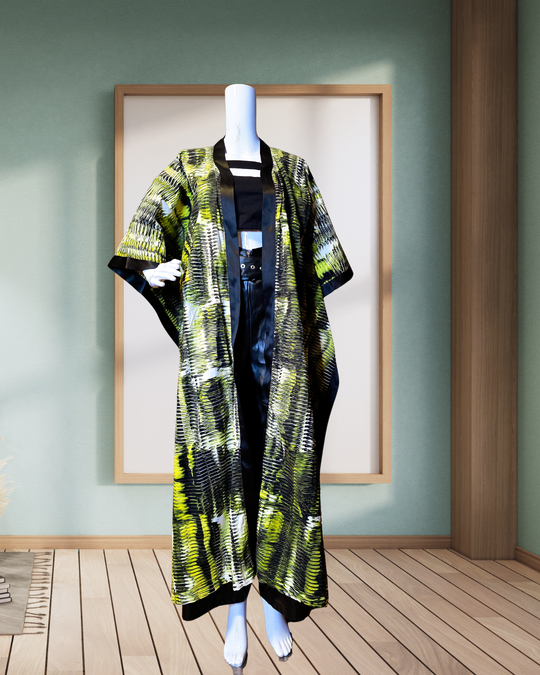 Long green and white pattern with a touch of black cover up.Vibrant, elegant, stylish and versatile designs that blends global trends and fashion.Great for casual wear, formal wear and for festivals and its a fashion staple...Regular price $110.00 -